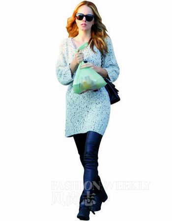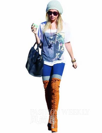 图案Tee,牛仔蓝紧腿裤,长到大腿的灰色针织袜与系带过膝靴,Ashley Tisdale 可谓青春逼人。