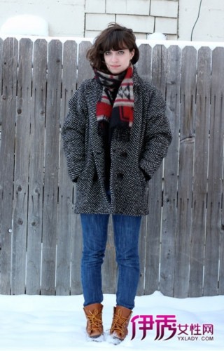 一片黑色之中用围巾突出色彩感,红色的印花围巾就很能胜任这个任务,搭配短靴和上身的黑色和谐统一。