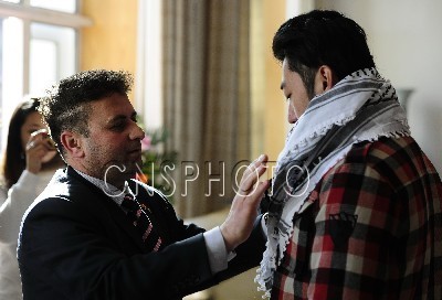 3月7日,巴勒斯坦国驻华使馆举行“帮助巴勒斯坦内外难民营的儿童”义卖活动。义卖会上所出售的义卖品均是巴勒斯坦国内的志愿者无偿手工制作的富有当地风情的各式手工艺品,此次义卖活动将持续到4月3日。图为一名使馆工作人员为中国青年亲手佩戴其选购的围巾。