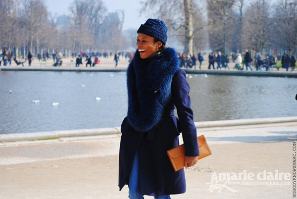 时尚编辑一袭ALL BLUE打扮透露着庄重与优雅,泛着神秘的时尚光芒,这种高贵的气场的产生皮草领子功不可没。觉得全身都是蓝色难免阴郁不明朗?一款橙色手拿包点缀就解决了这个问题。