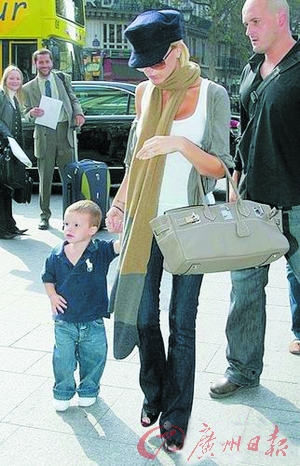 与儿子悠闲逛街的维多利亚长及小腿的三色围巾并不厚重的材质更显飘逸;
