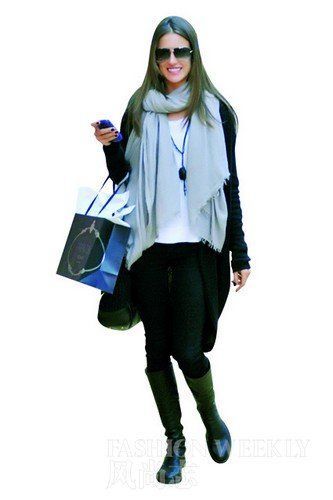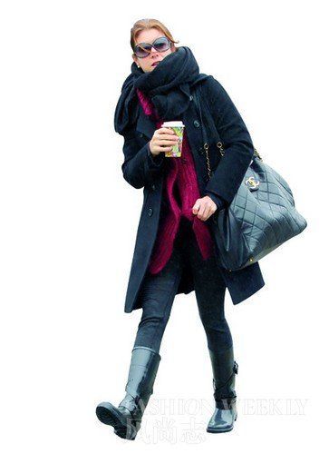 黑色的外套,裤子,靴子搭配白色的T-恤,陪衬一款淡灰色的大围巾,整个人是不是既随性,又抢镜呢!