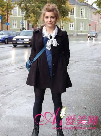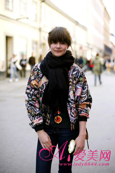 复古印花外套加上单色系黑色围巾,既时尚又不显得唐突。