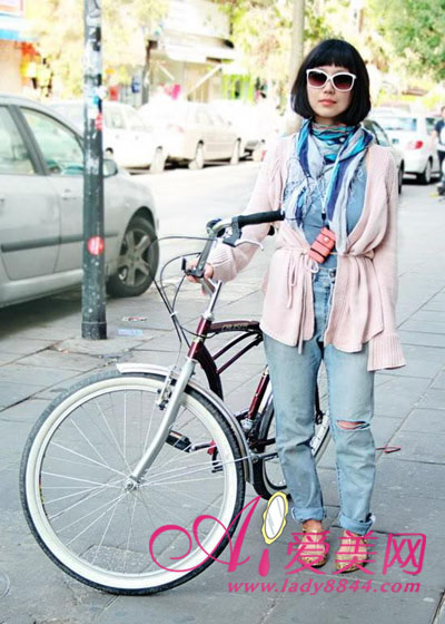 彩色竖纹围巾,旁边的自行车很是亮点。