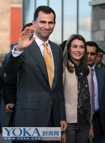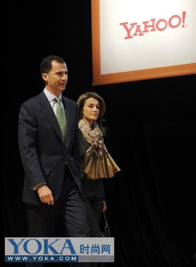 随王储出席经济峰会的王妃深谙各种场合搭配之道,一身黑色职业装过于严肃,搭配印花围巾,颜色多变的印花和米色主体相呼应,调动了整体色系的闪亮度又不失庄重和轻盈感。是不是特意为后方的YAHOO LOGO色系相呼应的呢?