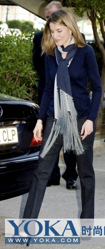 王妃似乎深谙渐变色系搭配之道,深蓝色针织开衫过于严肃庄重,搭配带有蓝色渐变系的流苏围巾搭配,绕于颈处,随意一系,竟无形中延伸了颈部长度,增强了身材的黄金比例,渐变色系也不会过于跳跃,使整体造型感觉显得突兀。