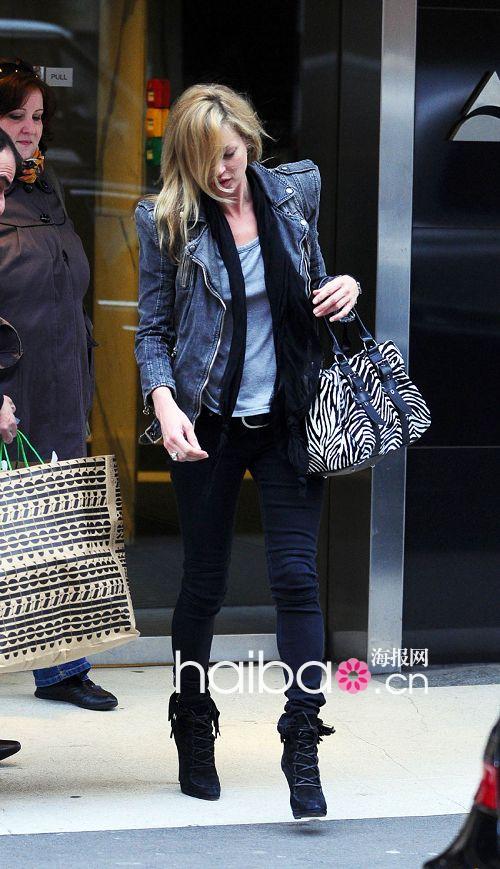 亚历山大·安布罗休 (Alessandra Ambrosio) 选择的围巾虽是灰色,但飘逸感还是很有春天的味道,与机车皮夹克凑在一起,很酷哦。