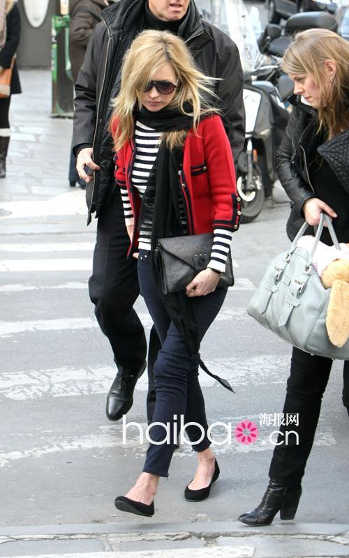 香奈儿的“威尼斯红”夹克与蓝白条纹打底衫的组合棒极了,凯特·莫斯 (Kate Moss) 更是聪明的用一条黑色长围巾来压住“浮躁”张扬感觉,整体LOOK相当亲和,值得学习。