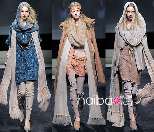 貌似层叠式围脖搭短款外衣会更出彩,但如果你选了过臀的长大衣,也可以学米索尼 (Missoni) 的模特,再搭一条较长的同色系长围巾来过渡,至少让围脖不会显得那么突兀。