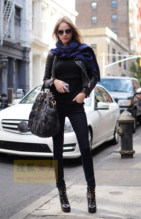 编辑解析:皮衣往往都是低领的款式,脖子还得加上一个大围巾来御寒。全黑的穿搭使得围巾的色彩选择就有很多了,如果喜欢硬朗就选暗色系的,想要活泼用明亮色调也很IN。