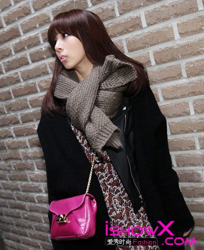两色拼接的一款针织围巾,是一款很好的减龄单品呢,围两层看起来更有味道。