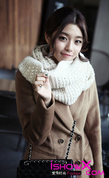 白色针织围巾,带有小复古的色彩,质地比较薄,搭配土黄色的毛呢大衣,很有韩式风格哦。
