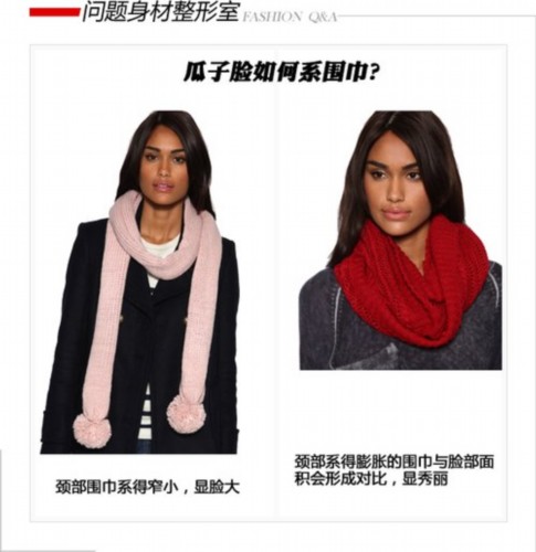 瓜子脸上宽狭窄,如果颈部围巾系得窄小,脸部会相对显得比较大;而在颈部系得膨胀的围巾与脸部面积会形成对比,可以将瓜子脸映衬得更加秀丽。