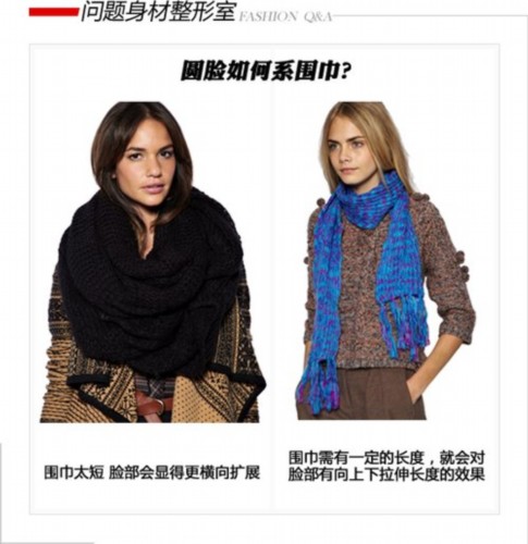 宽而短的圆脸型,如果围巾太短脸部会显得更想横向扩展,看上去脸部会显臃肿;如果围巾需有一定的长度,就会向下伸展,对脸部有向上下拉伸长度的效果,这样脸会显得窄小一点。