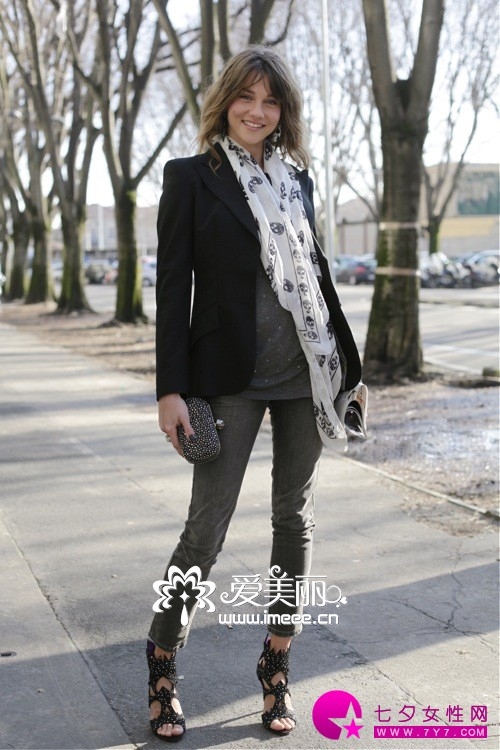 黑色围巾是常见的百搭款,随意围绕在脖子上就可以塑出白皙肤质。