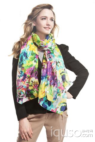 花开的春日里,时髦的印花与百花映衬,紫粉色印花,在薄薄的丝巾上肆意绽放,淡淡的花香瞬间入鼻