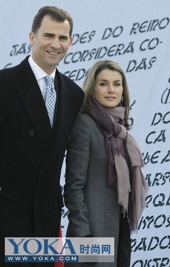 王妃似乎深谙渐变色系搭配之道,深蓝色针织开衫过于严肃庄重,搭配带有蓝色渐变系的流苏围巾搭配,绕于颈处,随意一系,竟无形中延伸了颈部长度,增强了身材的黄金比例,渐变色系也不会过于跳跃,使整体造型感觉显得突兀。