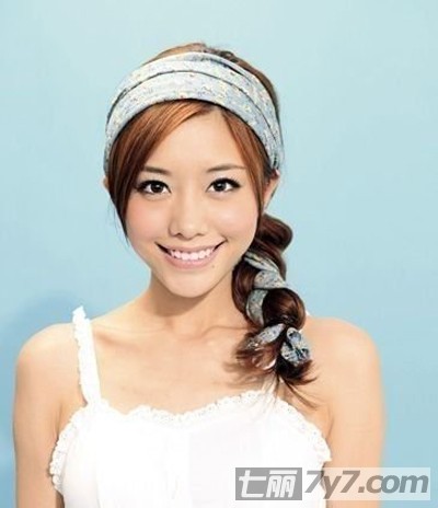 完成图:融入了碎花围巾的斜编发发型,很特别的感觉,看上去不仅甜美,更添清新优雅的感觉