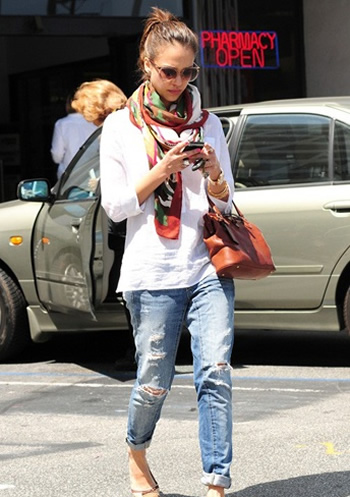 白色的纯棉上衫当然需要印花围巾去点缀,下身的破洞仔裤与平底鞋偏休闲,于是丝巾也宽松打理即可,让花色随着系出的纹理自然展现。