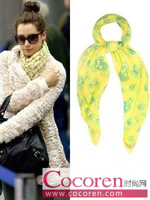 颜色鲜艳的丝巾衬托出青春的活力。选择颜色更为鲜亮的长丝巾搭配浅色外套,优雅而不乏活力哦。