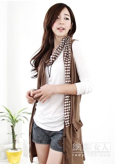 方格纹的围巾,简单的缠绕,配合长款开衫+短款热裤,这样的长短搭配,正是这个季节不可缺少的绝妙搭配。