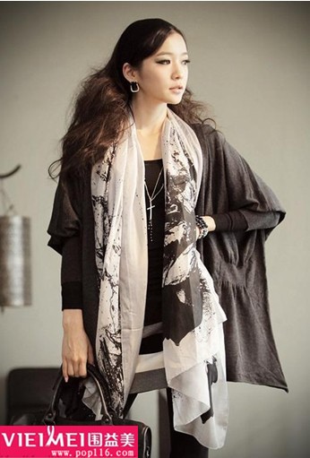 灰粉色水墨图案长款围巾,搭配同色系外套,大气,时尚。