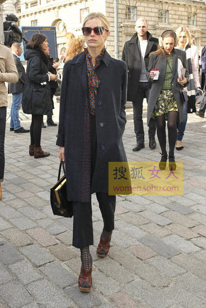 印花款丝巾衬衣搭配,在这个季节搭配一件长款呢外套和西裤,职业中透露着知性的气质。