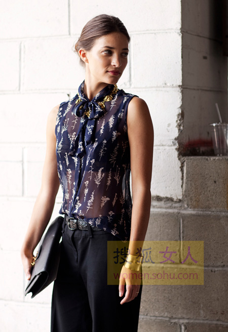 背心的款式加上十分女人的树叶衬衫,加上领口的丝巾装扮,女人味浓浓,搭配阔腿裤再合适不过了。