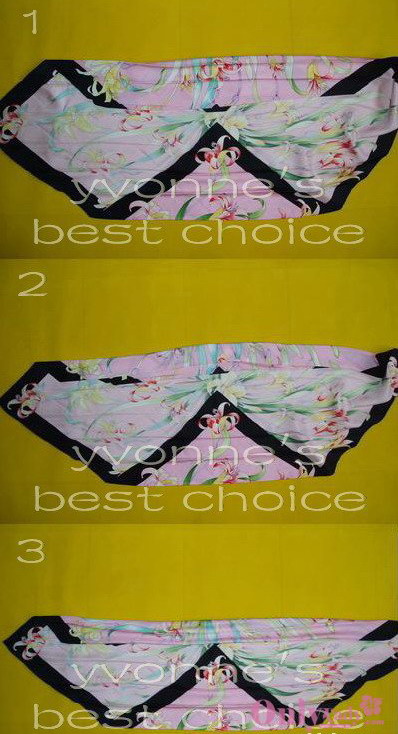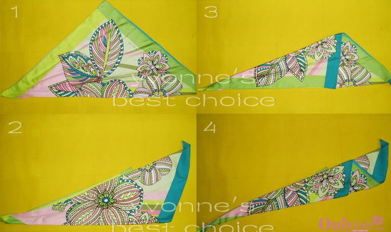 第二种折叠方法,带式。对角线折,真丝容易滑动,折后最好熨烫固定。带式5. 三叶草,是我很喜欢的一种系法。一根丝巾带居然变出三片叶子,看上去很难,但是稍微动手试一试就可以掌握了。