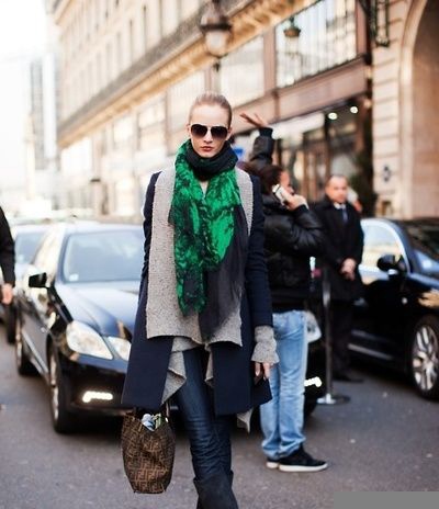 时装周秀场外的街拍最养眼最会教人怎么穿。浅驼色的厚呢风衣搭配超大复古挎包街头时尚味道十足,利用黑色的围巾搭配灰色基础款打底最合适不过,觉得不够“混”不够有型?街拍达人加身一条水蓝丝巾最点缀,效果瞬间扩大。