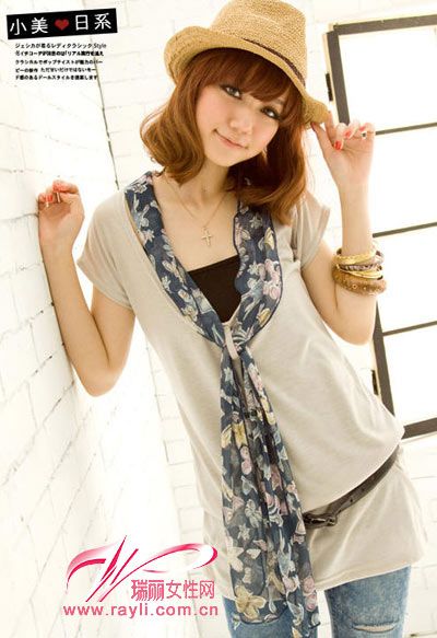 简洁而甜美的装扮,利用一条围巾,就可以营造出时尚亮眼的效果。米色T恤搭配海蓝底印花长巾,结合草编小礼帽,非常修身。