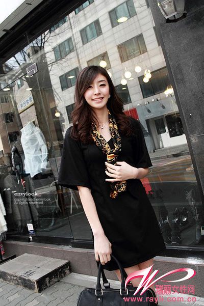 这种领带式的打法在中性之中反衬了女性美,搭配黑色连衣裙,打造成熟气质美女。