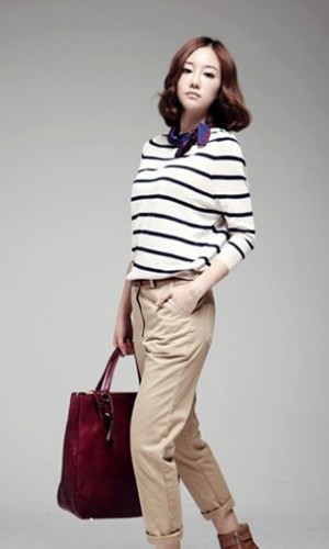 很简约的搭配,黑白条纹T恤简洁明快,米色休闲裤比较宽松,穿着起来十分舒适,可将裤腿卷起显得更加随意,小巧的蓝紫色方巾不太显眼却是整体不可缺少的一部分,他给形象增添了成熟的感觉,蓝紫色跟玫瑰红交错,让这身浅色服装搭配也具备了成熟女性该有的沉稳。
