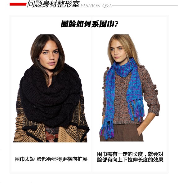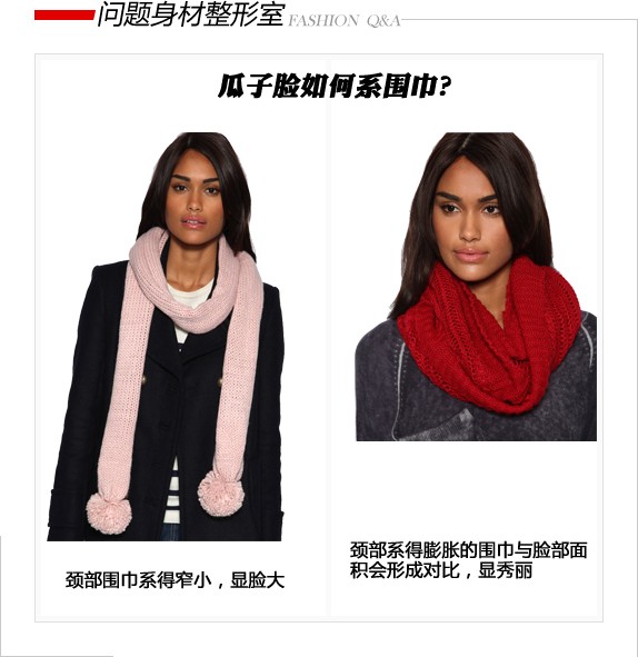 长而窄的脸型,围巾不适合太长,否则脸部会显得过于拉长,产生下垂感;长而窄的脸型,围巾要集中在脸部周围,横向扩展脸部会显得更加协调秀美。脸部比较方的MM,采用紧贴颈部的系法脸部会显得更加宽大生硬;而选用有垂感材质,和有悬垂效果的系法,脸部会营造出修长清秀