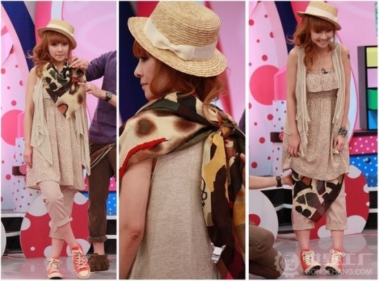 最爱丝巾的Nicole Richie,把素净图案的大丝巾随意缠绕在脖子上,搭配最简单的白色无袖背心。