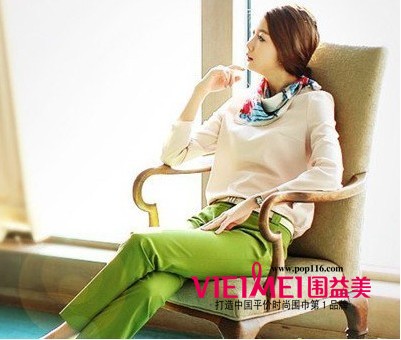 白色雪纺上衣,果绿色长裤,你是否已经看到了春天的颜色,搭配一条白底淡蓝图案的小方丝巾,时尚大方。
