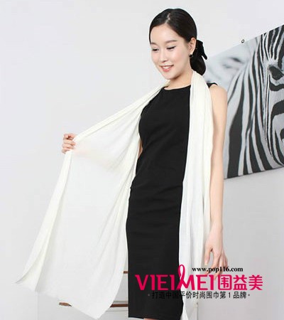 黑色修身雪纺连衣裙,搭配长款纯白色丝巾,简单,大方,知性味十足。