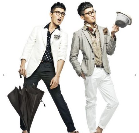 左 蓝色白点衬衫Marc by Marc Jacobs 眼镜:Versace(亮视点) 白色西服及口袋巾:Corneliani 深蓝色裤子:Zara 棕色皮鞋:Tod's 雨伞:私物