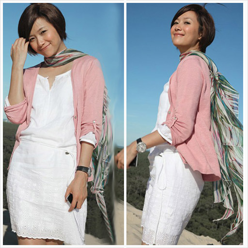 徐静蕾的粉色小薄外套配上一条白色纯棉连身裙干净清爽。条纹的真丝长围巾随意的系在颈间在微风的吹拂下别有一翻韵味。