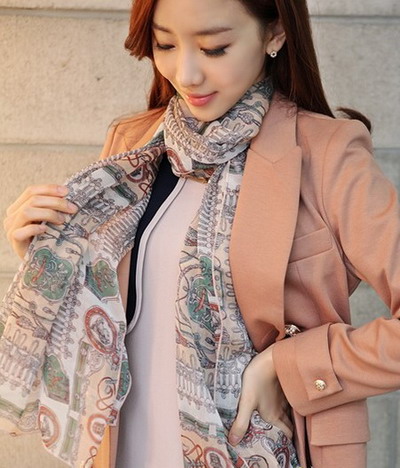 粉色系的丝巾更显柔美感,如果你觉得自己还不够女人,系上一条这样的丝巾准没错了。