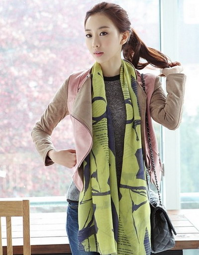 绿色字母印花的丝巾,搭配休闲风格的装扮也时尚有型,春意十足。