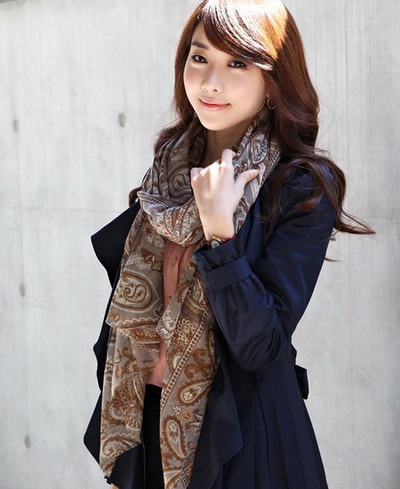 民族风图案的丝巾,搭配甜美风格的风衣,显出女生沉稳成熟的一面,给人十足的亲和力。
