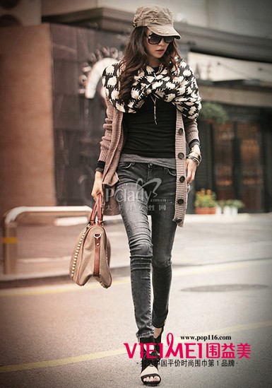 08 修身毛线衫混搭热裤,亮出性感的腿部线条,靴子的硬朗带来帅气的味道,混搭斑马纹丝巾,打破素色衫的单调,同时给中性Look注入不少女人味。
