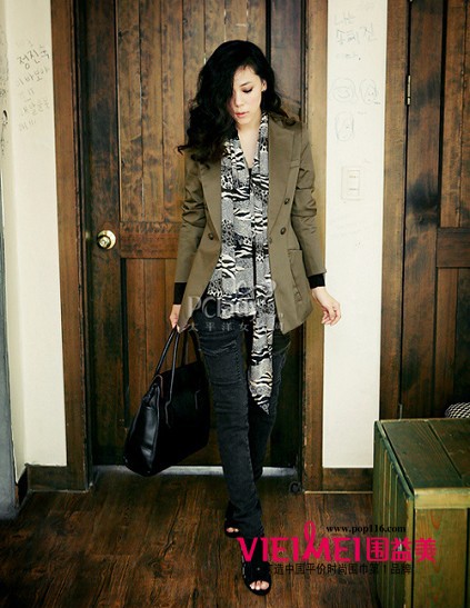 04 军绿色的小西装是很多MM的大爱,搭配深色铅笔裤和鱼嘴高跟鞋,中性气质Look立现,加条黑色印花丝巾,飘逸的灵动感给比较沉闷的颜色带来了层次感,魅力女人味很浓郁。