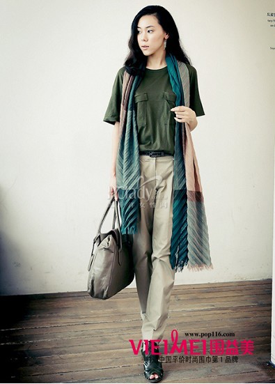 03 休闲装其实也可以混搭丝巾。柔软的深绿色棉T以口袋修饰,很有欧美风,混搭卡其色裤装,变得很有亲和力。一条渐变拼接散口长丝巾,给休闲风注入了儒雅和大气,变得比较正式,一点也不显得“随便”。