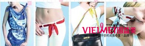 发挥程度最大的用法。你可以任意选择一款色彩鲜艳的丝巾(但尽量选择纱质或薄丝巾,缎面的会显得过厚),简单叠折整理一下,就可以作为腰带使用。如果是大号的丝巾,还可以对折后系在大腿一侧,也是不错的方法。