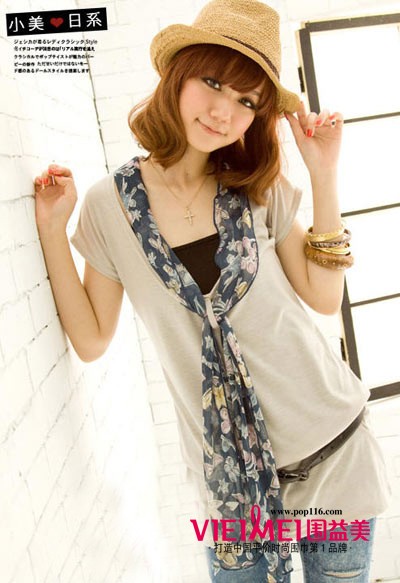 简洁而甜美的装扮,利用一条围巾,就可以营造出时尚亮眼的效果。米色T恤 搭配海蓝底印花长巾,结合草编小礼帽,非常修身。