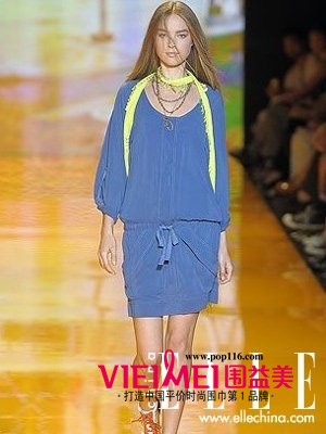 DKNY将亮黄色细条围巾搭配纯蓝色连身裙,简单的搭配,将整套服饰的效果明显提升,少女般的活泼魅力不言而喻。