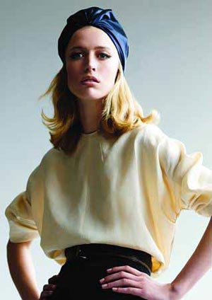 发型师奥兰多?皮塔最为懂得如何将酷酷而又随意的感觉演绎到极致,他为Marni时装秀所搭配的纤细弹力发带就完美地体现了这一点。首先,先把头发向后梳,在头底部扎起来,然后再将一个弹力细发带戴在距前额1英寸的地方。如果脸型较大的话,还可以再挑出发带前几处主要位置的头发,将它们弄松,制造出零乱感。
