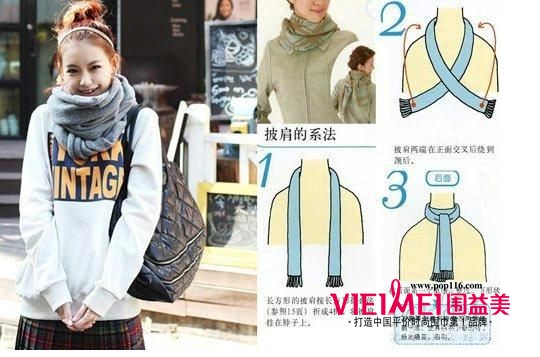 在具体搭配方面,大家不妨参考尤其是一些欧美明星的出街装扮。这里我说说几个搭配原则。 接下来教你几款新搭配法 首先将围巾,对折成长条形,将其套在脖子上。然后两端正面交叉后绕到颈后,在后面系一个单结,整理下形状,让其自然下垂,感觉随意自然。造型自然、流畅、时尚,因为结系在身后,所有从后面看起来背影同样靓丽动人。 韩式乞丐混搭结 首先这款围巾就很个性,之所以称它为乞丐结就是因为它很有破旧的效果,HOHO~~。别看它系出的效果好像很复杂,其实系法很简单哦!把围巾从前面挂到脖子上,围巾两端在颈后交叉后再绕到胸前,把右手边的拉出一个小孔让左侧的边穿过去搭到背后,右边的同样穿过左边拉的孔搭到背后。这样的围巾搭配休闲衣服 很适合哦! 围益美围巾品牌逐渐透过它的休闲和时尚的口味,在竞争白炽化的零售商业中,日益表现出非凡、超强的生命力。作为一种自我实现,为了满足消费者的审美观念,多年来推陈出新,“我们的努力使您与众不同”含义是希望每个人在自己的舞台上展现自我,实现自我,这就是围益美自身文化魅力所在。经历十年市场的考验,围益美发现,缔造围巾品牌的真谛不仅限于围巾本身,而在于建立顾客的形象信仰。